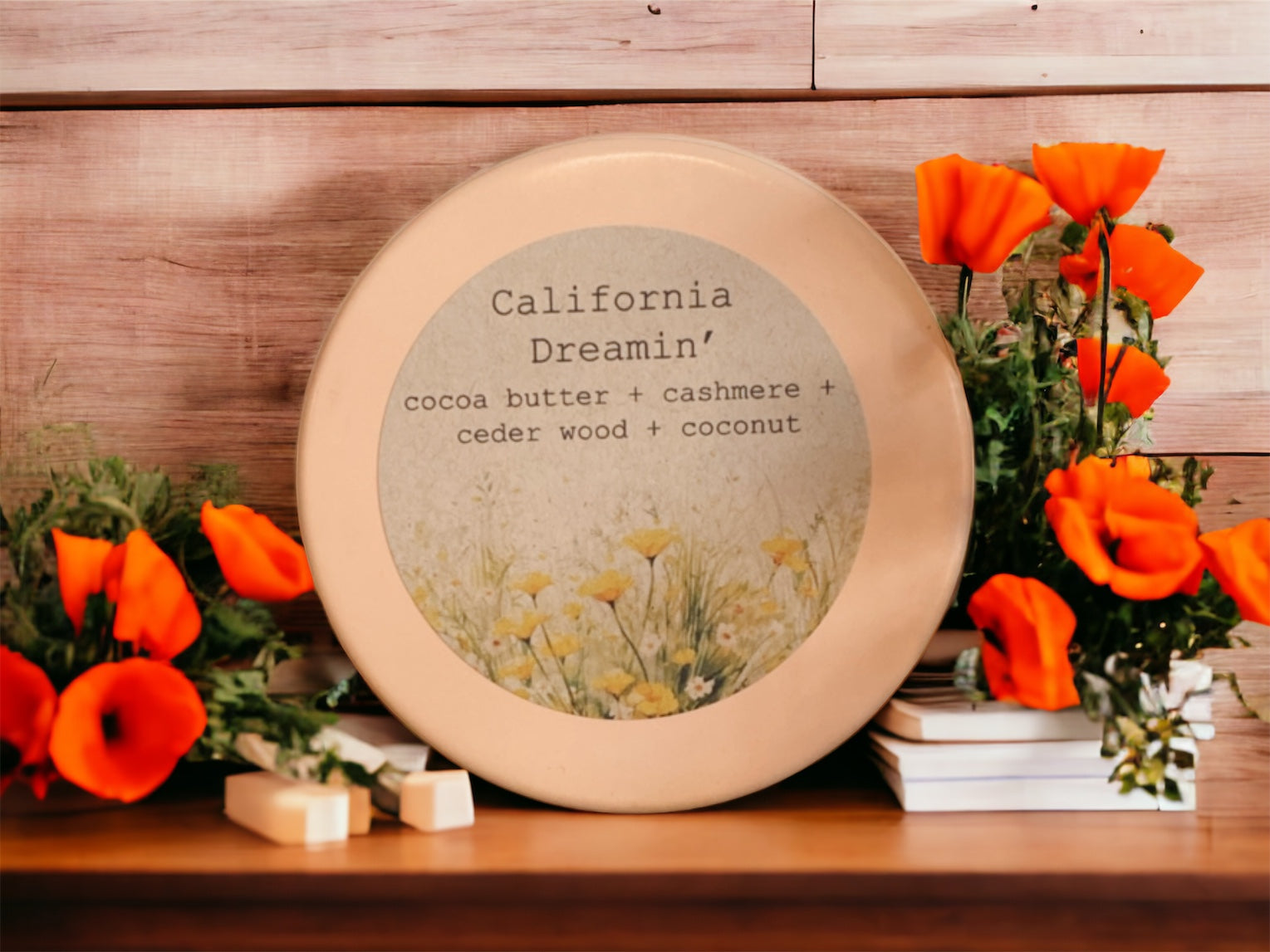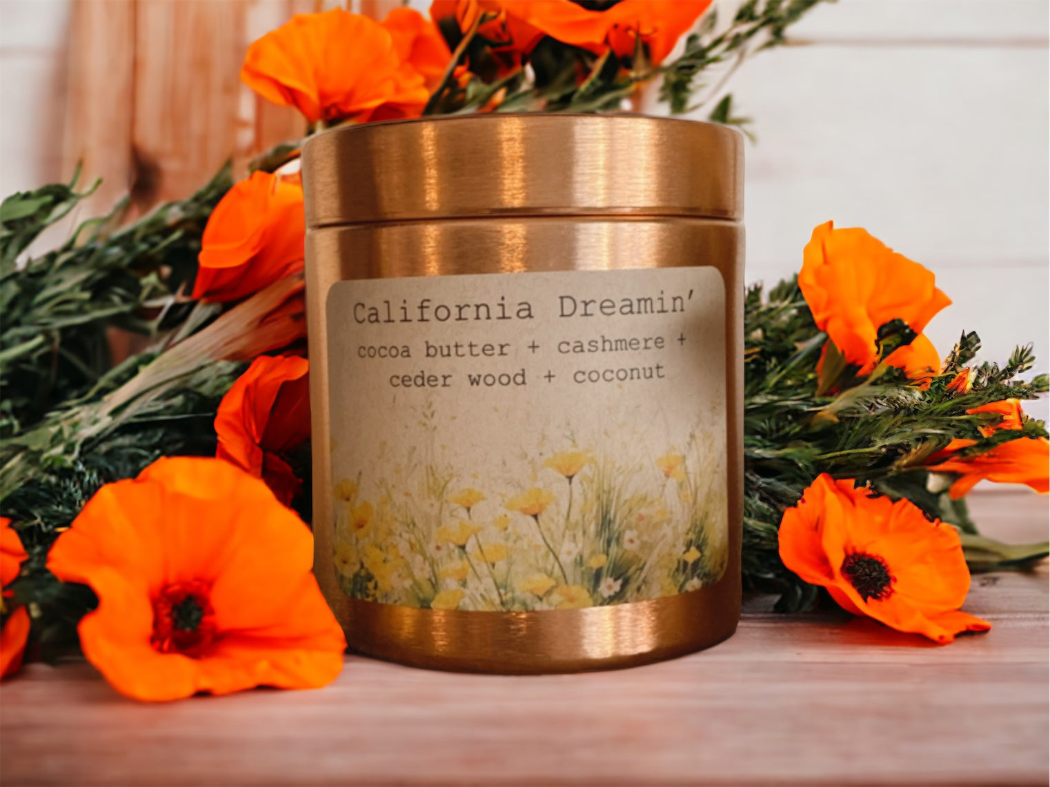 California Dreamin'. A California girl, born and raised, this has quickly become a staple in our home. A beautiful harmony of cocoa butter and amber. Named after the famous The Mamas & The Papas song, let this scent melt all your cares away!
