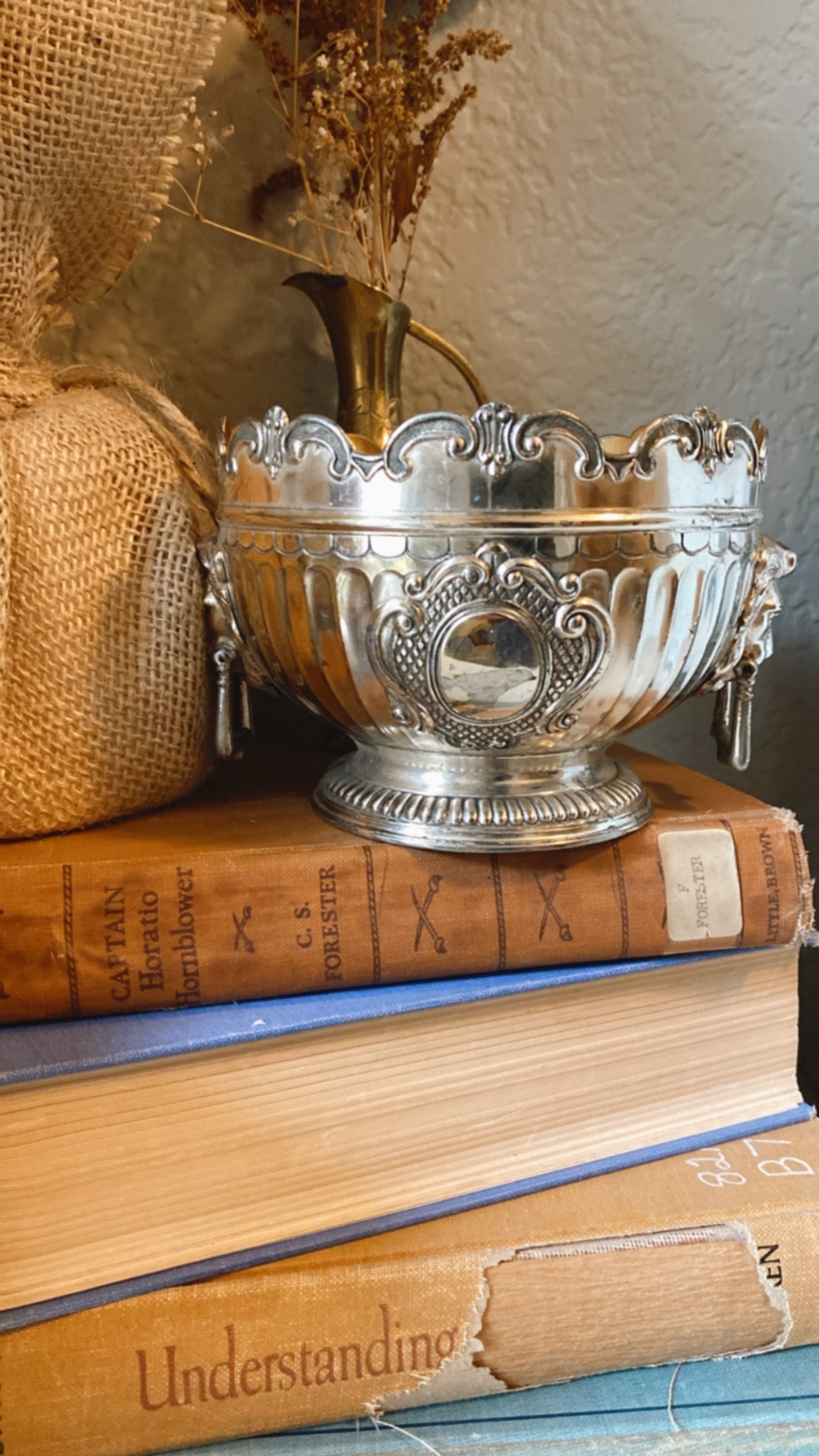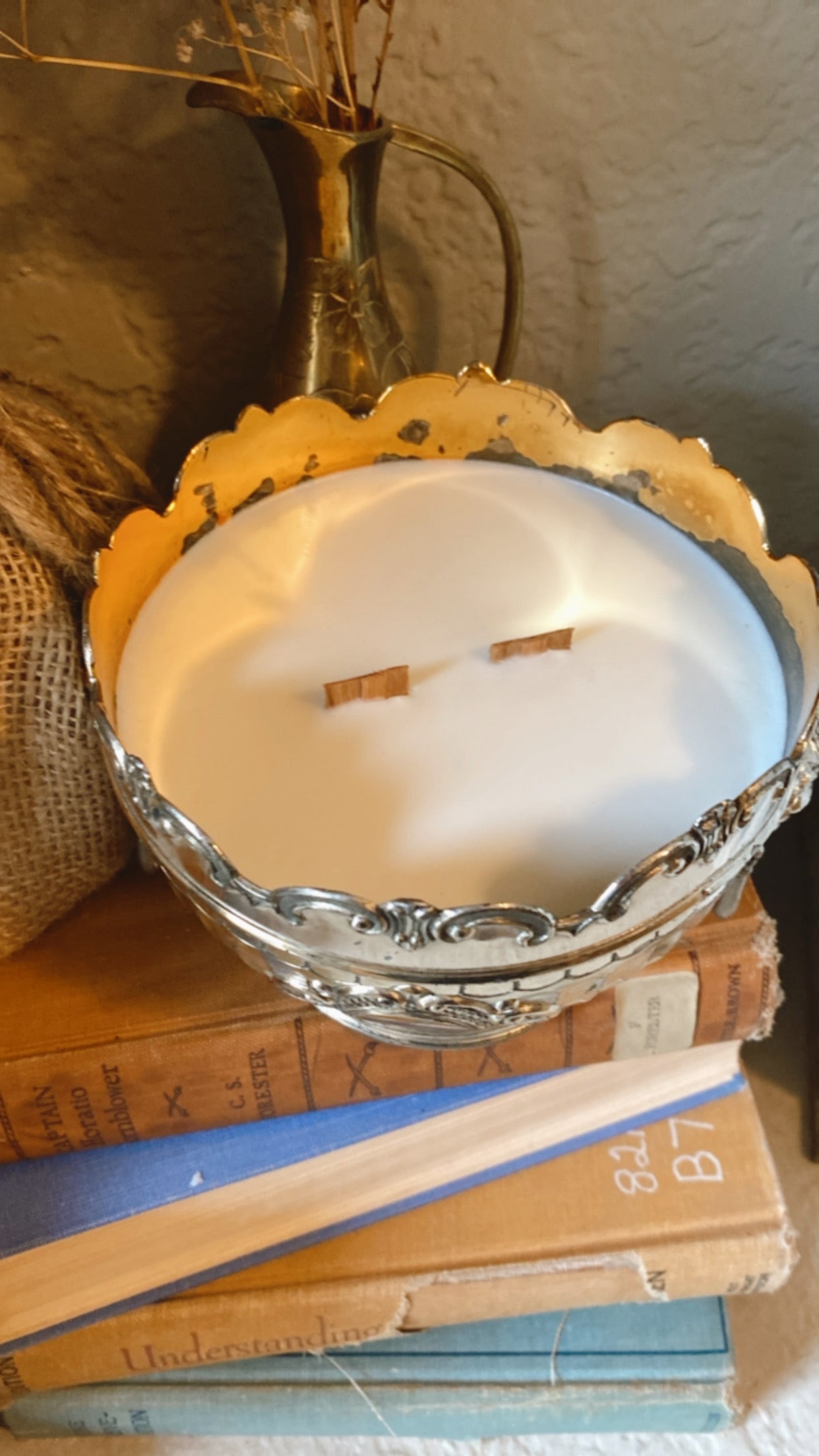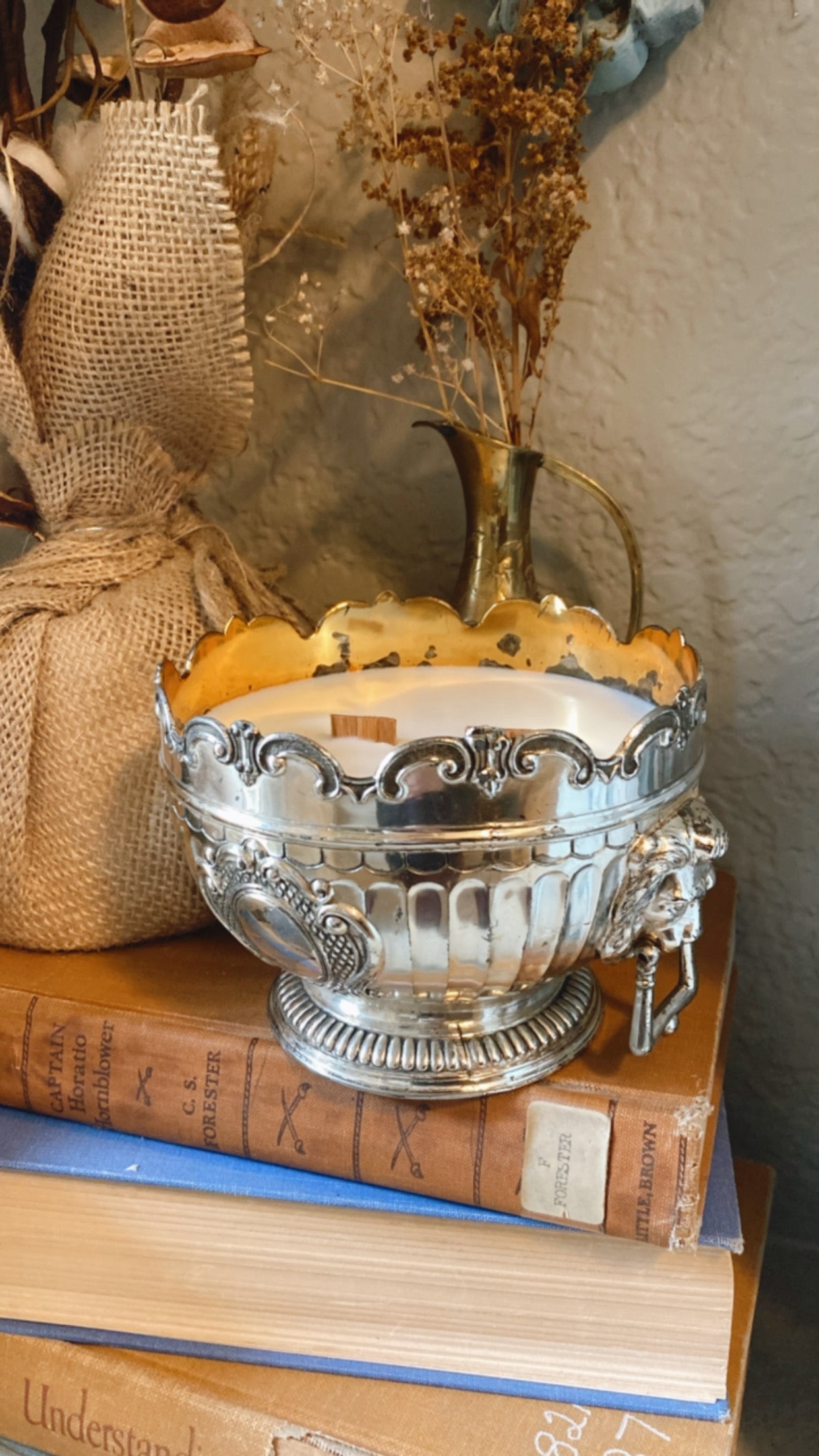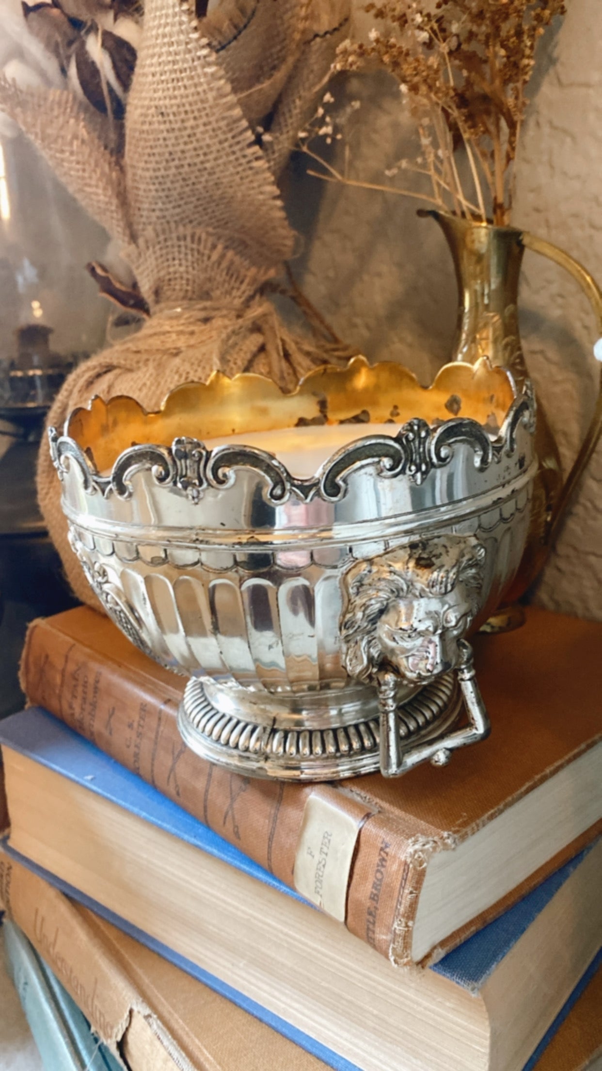 Eve was once a gorgeous rose bowl with lion head handles. Now she is a beautiful heirloom candle filled with 14.4oz of Fountain Ave. She still comes with the original metal flower frog for when her time as a candle is done.