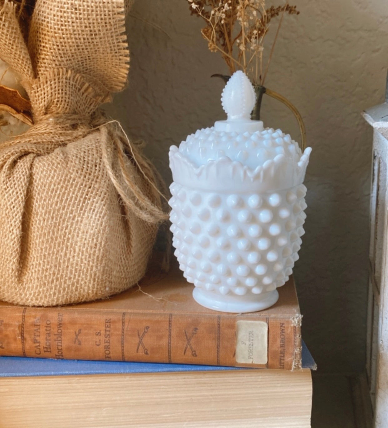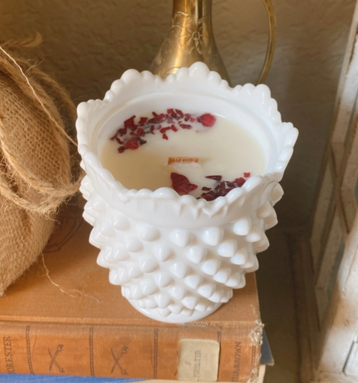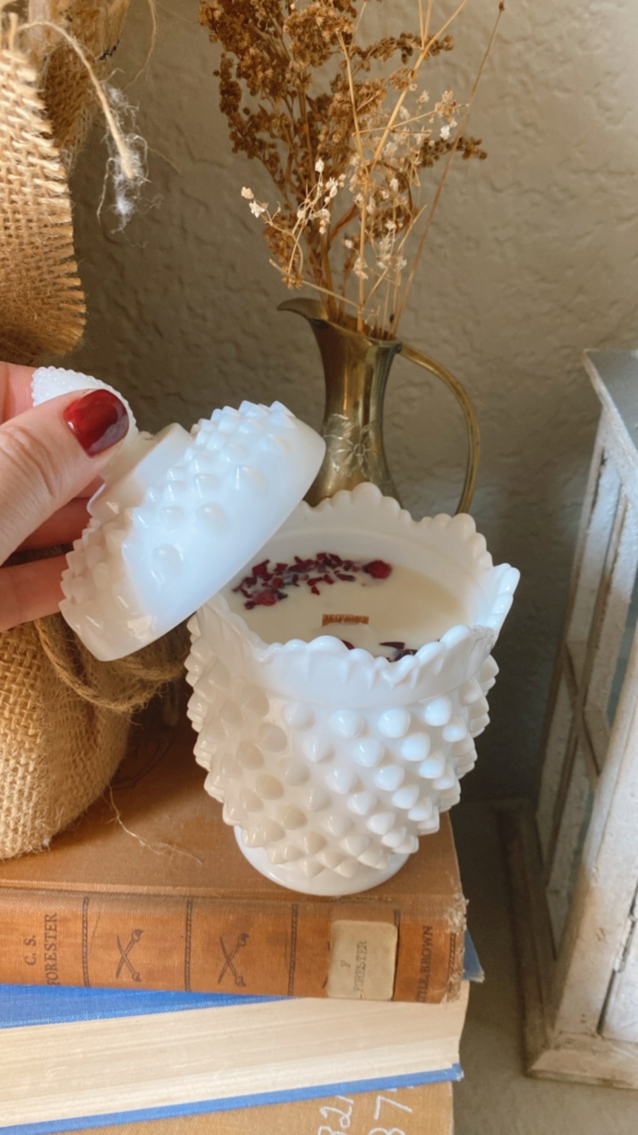 Paige. This adorable Vintage Fenton Hobnail Milk Glass Sugar is filled with 5.8oz of I’m Your Huckleberry. Named after my daughter, this candle is sweet and little with just a little edge. The beautiful scalloped rim and beaded handle make every inch of this vintage vessel special!